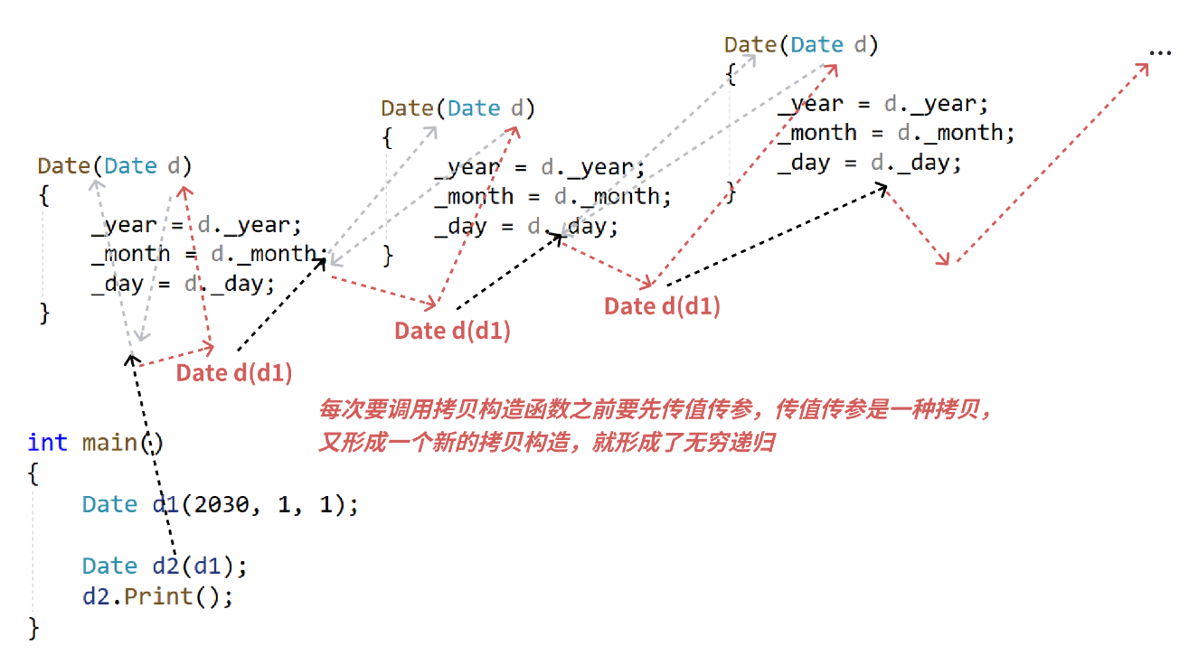 Date d2(d1) ;这就是 调用了拷贝构造函数。然而,当下一步进入拷贝构造函数后,函数的形参 Date d 需要 拷贝 传过去的实参d1,这个过程再次调用了拷贝构造函数,然后下一步进入拷贝构造函数,Date d 又要拷贝 Date d1......如此无限循环,就是无穷递归调用了。这样应该挺好理解了。