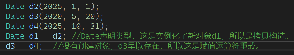如图中注释的解释。 所以为了避免混淆,可以习惯使用Date d1(d2)作为拷贝构造,也是锻炼自己使用新语法,大多数情况下也提高了代码可读性。