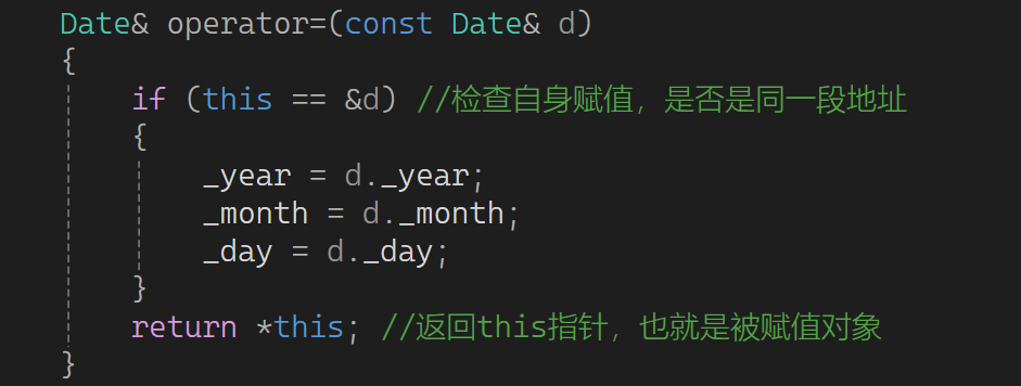 如图,返回类型 Date& ,引用返回可以减少拷贝,提高效率,前提是引用对象出了函数作用域还存在,没被销毁。 为什么要返回this指针?因为 表达式 比如: d1 = d2 ,即d2赋值给d1,其中d1作为左侧运算对象 就会传给第一个参数,也就是隐式的this指针。