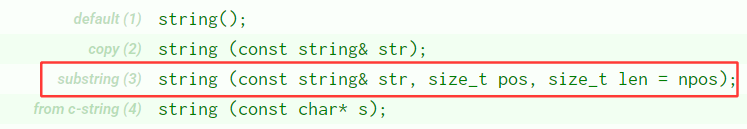 如果给的参数错误,比如远远超过了字符串的字符数量,那么len就是npos,缺省值npos,不传参数也是npos,所以: