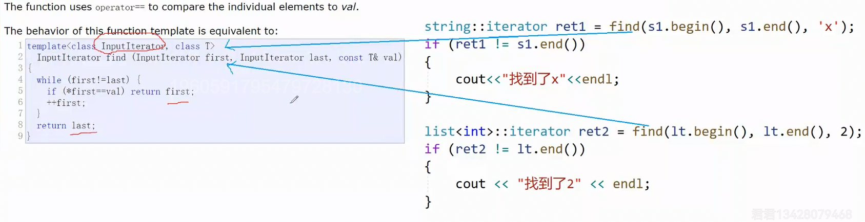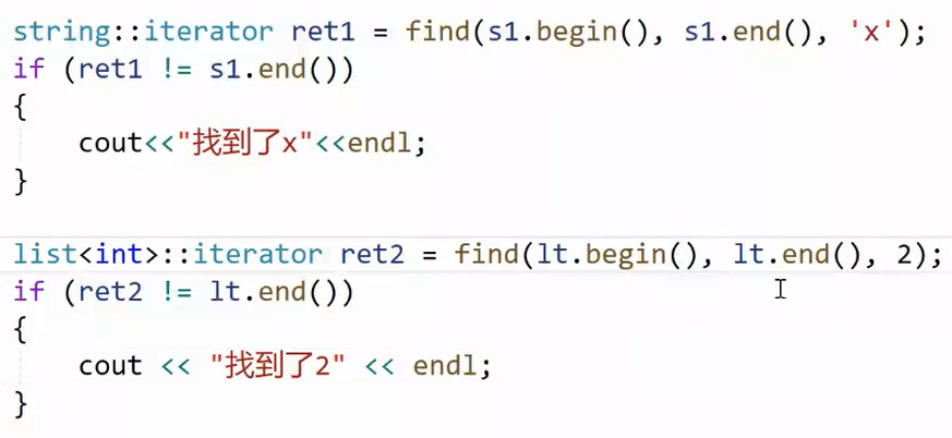 像之前我们写的算法,比如查找函数 find,都是针对某一个具体容器的,比如针对数组,字符串,现在,借助迭代器,我们可以将这种算法泛型化: