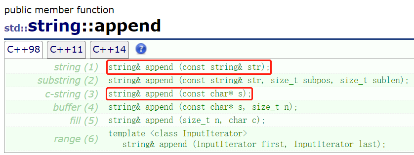 append就重载了很多个版本,可以插入字符串,字符,部分字符串,多个字符等等: