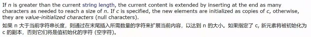 resize | 将有效字符的个数改成n个,多出的空间用字符c填充 |