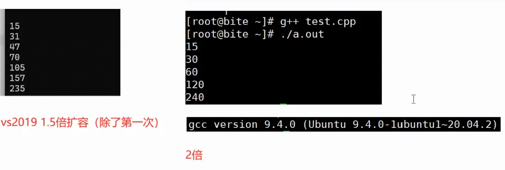 右边这串代码在vs和gcc,gcc会先二倍扩容,然后二倍缩容,vs则只是会扩容,不会缩容。具体取决于编译器