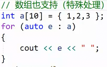 }支持迭代器的容器,都可以用范围for,范围for的底层其实就是迭代器。数组也可以,因为数组的行为类似于迭代器,所以被特殊处理过,也可以用范围for: