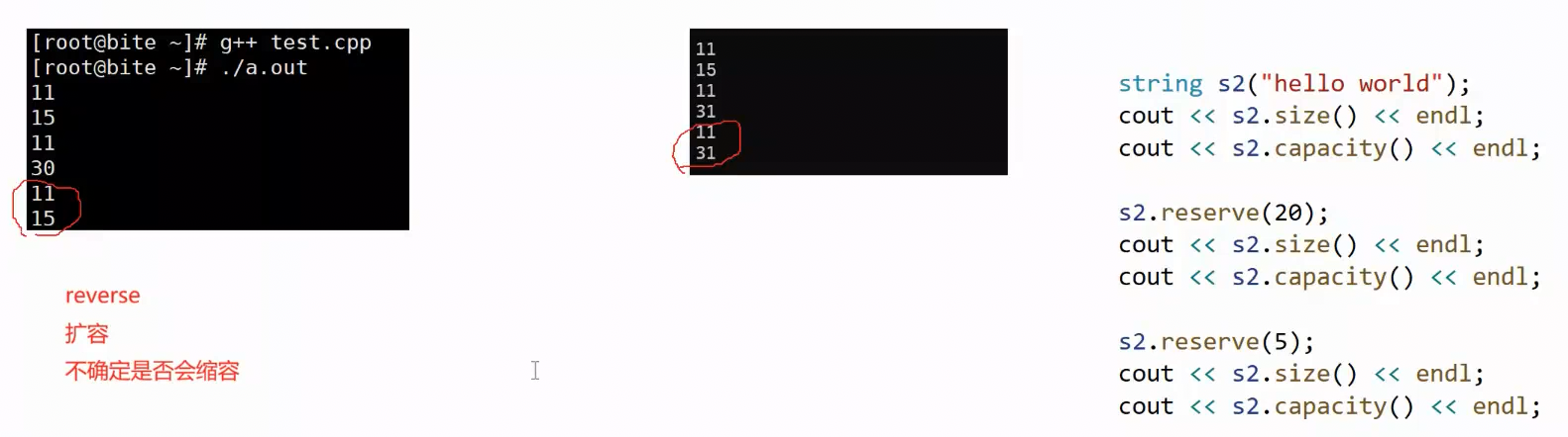 world” 是11个字符(空间是15),在vs下:reserve(20)(增加到20空间)就会增加到31,进行二倍扩容。在gcc中也一样,二倍扩