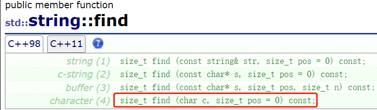 第四个是重点,是在指定位置开始往后查找字符c,找到返回其索引,没找到返回npos(INT_MAX):