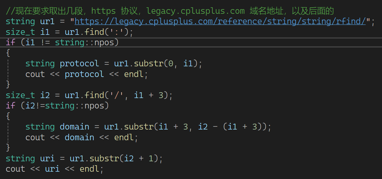 学会上面的几个函数,就可以来一个小应用:分段取出协议,域名地址等,不难,就是注意find后,下一次find的边界问题。