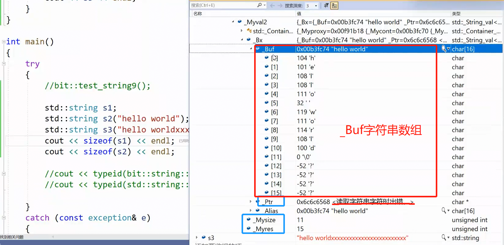 如图,看右边可以发现,其底层多了一个字符串数组:_Buf ,16个字符的字符串数组,可存储有效字符数为15