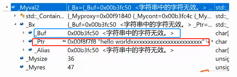 一旦字符串存入的有效字符数大于15,_Buf存不下了,就会转到_Ptr 内