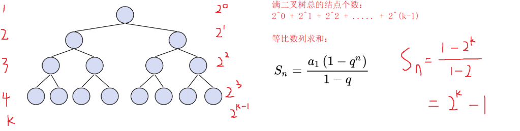 ⼀个⼆叉树,如果每⼀个层的结点数都达到最⼤值,则这个⼆叉树就是满⼆叉树。也就是说,如果⼀个⼆叉树的层数为 K ,且结点总数是的k方-1,就是满二叉树。