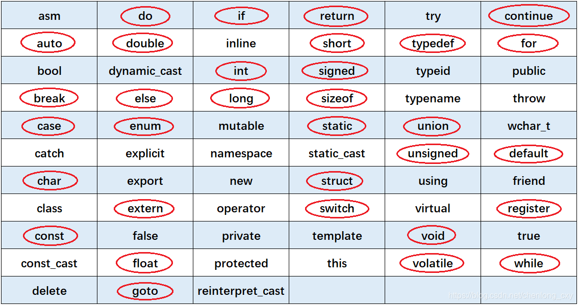 C++共计63个关键字,其中圈主的32个是C语言共有的: