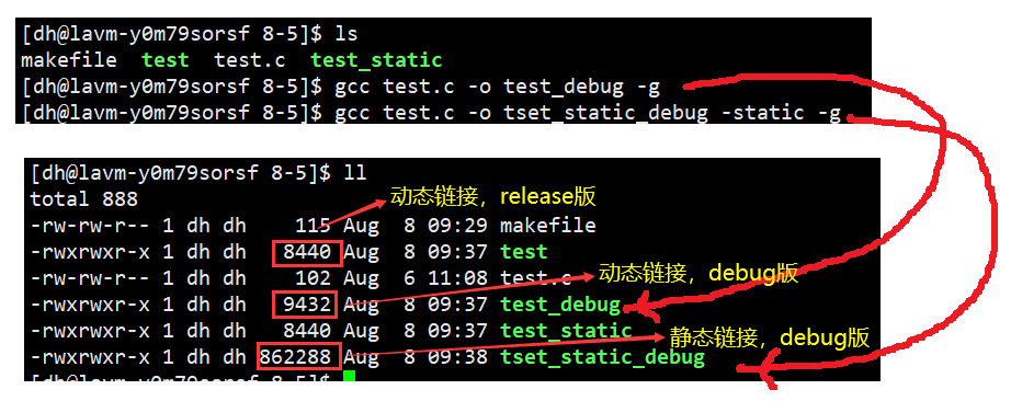 我们可以发现动态链接的debug版本占用空间略大于release,静态链接也是如此
