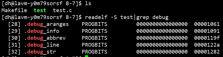 同时我们还可以借助管道,使用grep对二进制格式中的信息进行搜索,其中-i选项是忽略大小写进行查找,由于test是release是发行版本,没有添加debug信息,所以无法查找到debug,test_debug是debug版本,添加了debug信息,所以可以查找到debug