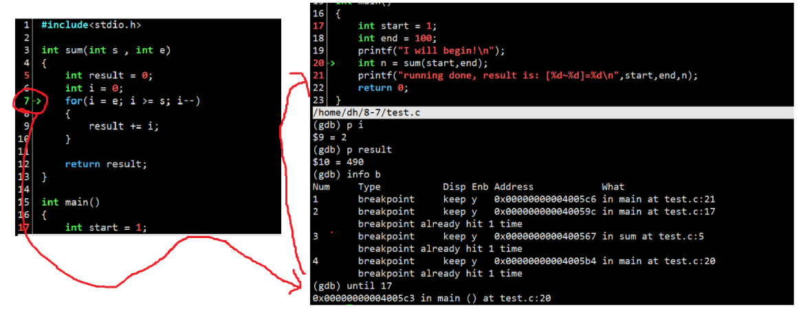 break / b [文件名:]行号 | 在指定行号设置断点 | break 10 / break test.c:10 |
