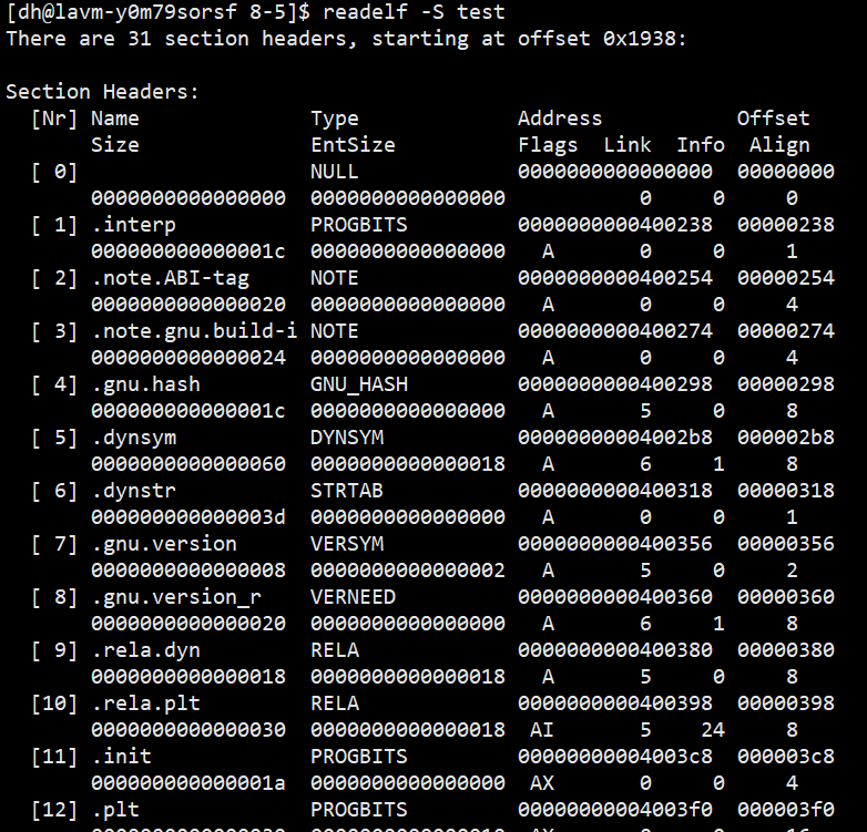 readelf -S 可执行文件名 可执行文件形成的时候不是无序的,而是有独特的格式,可执行程序有自己的二进制格式(elf格式),我们可以使用readelf -S 可执行文件名,来进行查看可执行文件的二进制格式