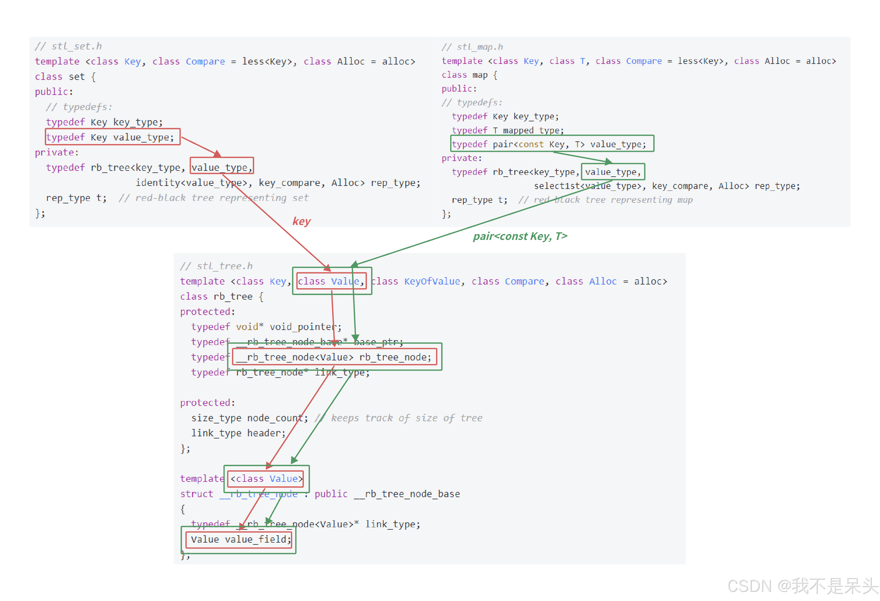 源码中的命名容易引起理解上的混淆。模板参数通常用T来表示Value,但这里的value_type并不是我们日常理解的key/value结构中的"值",而是指红黑树节点中存储的完整数据类型。对于set来说,value_type就是key本身;对于map来说,value_type则是包含key和value的pair对象。这种命名方式虽然在源码层面有其合理性,但确实需要我们自己去转换思维角度去理解。