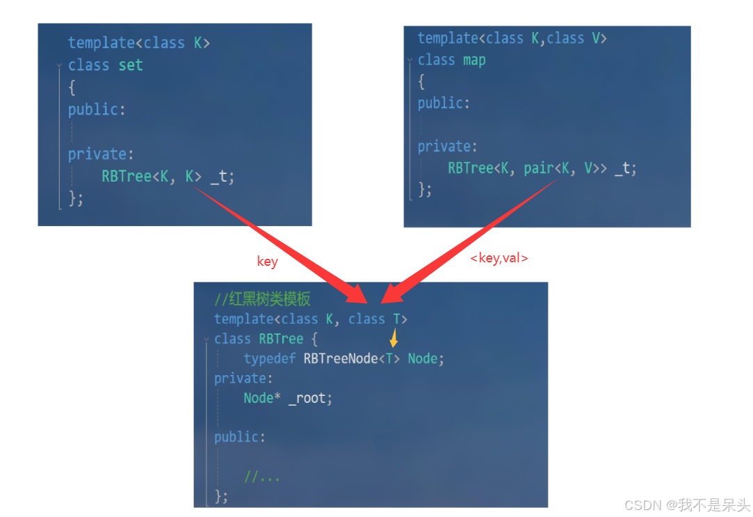 set.h 于 map.h 的类模板参数我们都知道,set是K模型的容器,而map是KV模型的容器,那我们如何用一棵KV模型的红黑树同时实现map和set呢?
