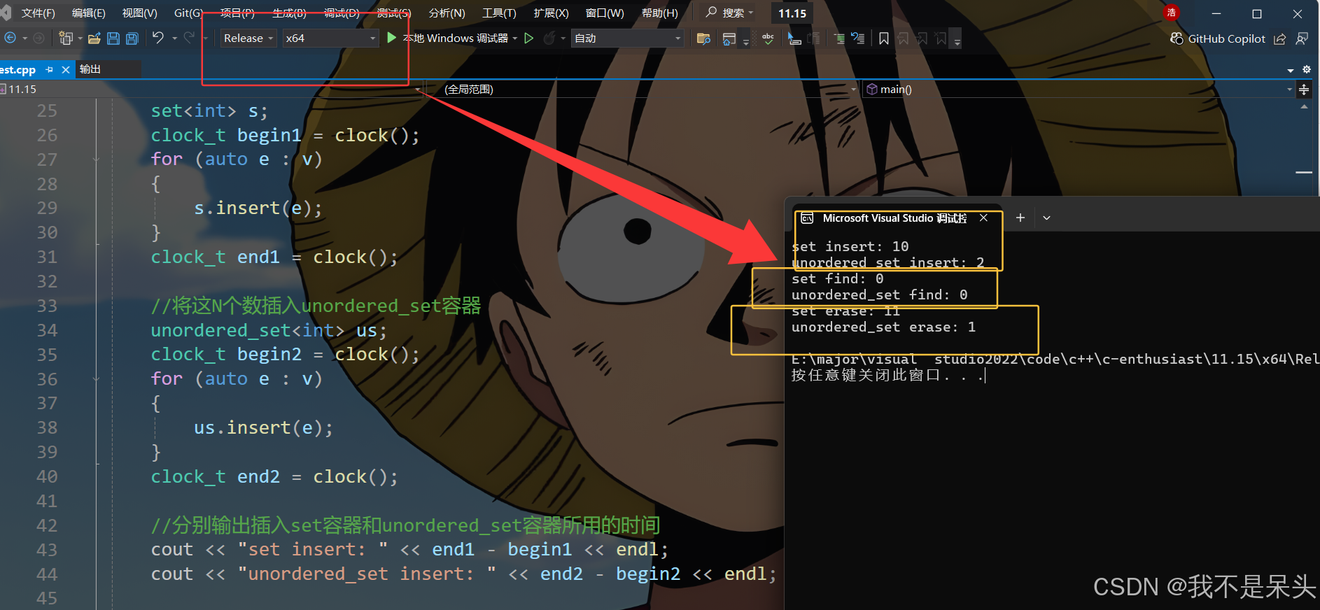 在Release版本下,set容器和unordered_set容器对1000个数做增删查改操作所用的时间更是被优化到了接近0毫秒。