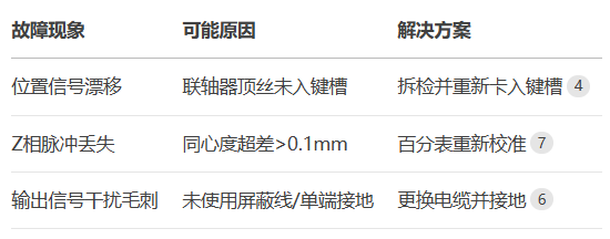 编码器作为一个测量位置或速度的精密传感器件,在实际使用上,轴的同心度可能影响脉冲的波动和异常,所以一般要控制在一定的范围内:精细调整至百分表跳动<0.05mm。