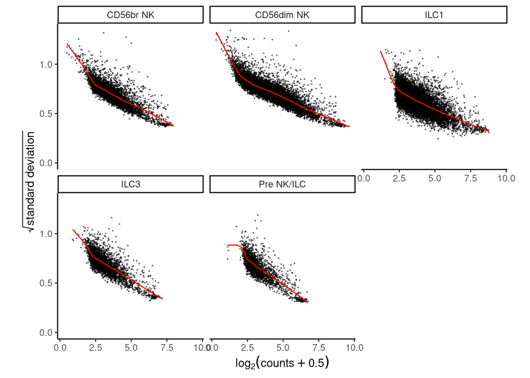 res.proc = processAssays(pb, ~ tissue + donor_age + sex + cmv, min.cells=10, min.count=5, min.prop=0.1, BPPARAM=multicoreParam)#展示了通过voom方法得到的各细胞类型的均值–方差(mean–variance)关系趋势。