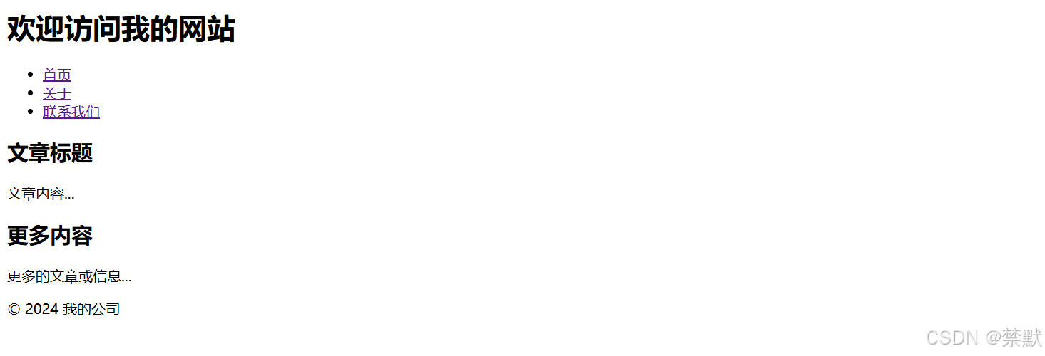 <header>:表示网页或网页部分的头部区域,通常包含网站logo、导航、搜索框等元素。<footer>:表示网页或网页部分的底部区域,通常包含版权信息、联系信息等。<nav>:表示导航栏,包含指向其他页面的链接。<article>:表示独立的内容块,通常用于博客文章、新闻报道等。<section>:表示文档中的独立区域,用于将内容分割成不同的部分。<aside>:表示与主内容关系不大的内容,例如侧边栏、广告等。<main>:表示页面的主要内容区域,每个页面只能有一个 <main> 元素。<mark>:用于高亮显示搜索结果或关键字。<header>