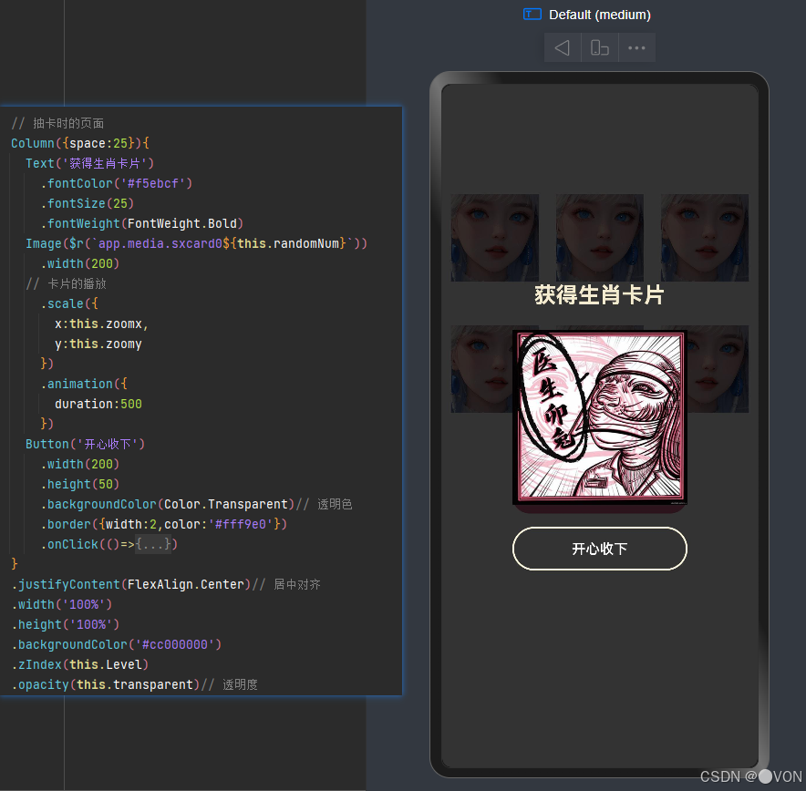 点击开始抽卡的时候会弹出这一界面,原理就是层叠关系的转变以及透明度的更改。点击开心收下时所属卡片的数量会加一,还可以接着抽卡。
