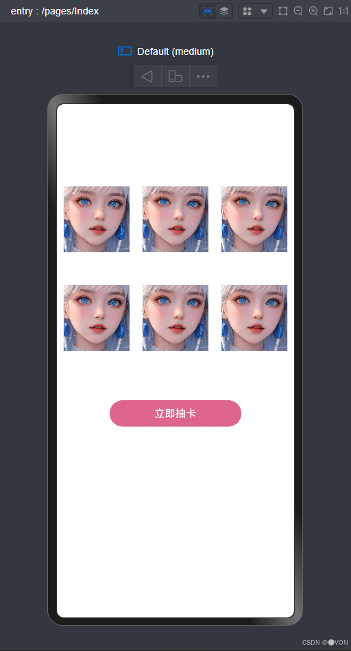 没有抽到任何卡片时的一个界面,这个页面的构建相对简单一些。方法也有很多,初始时的图片是自定义的一张图片,立即抽卡是一个Button组件。