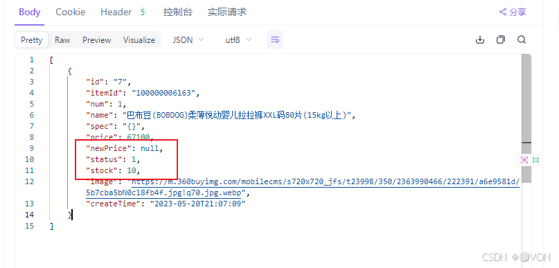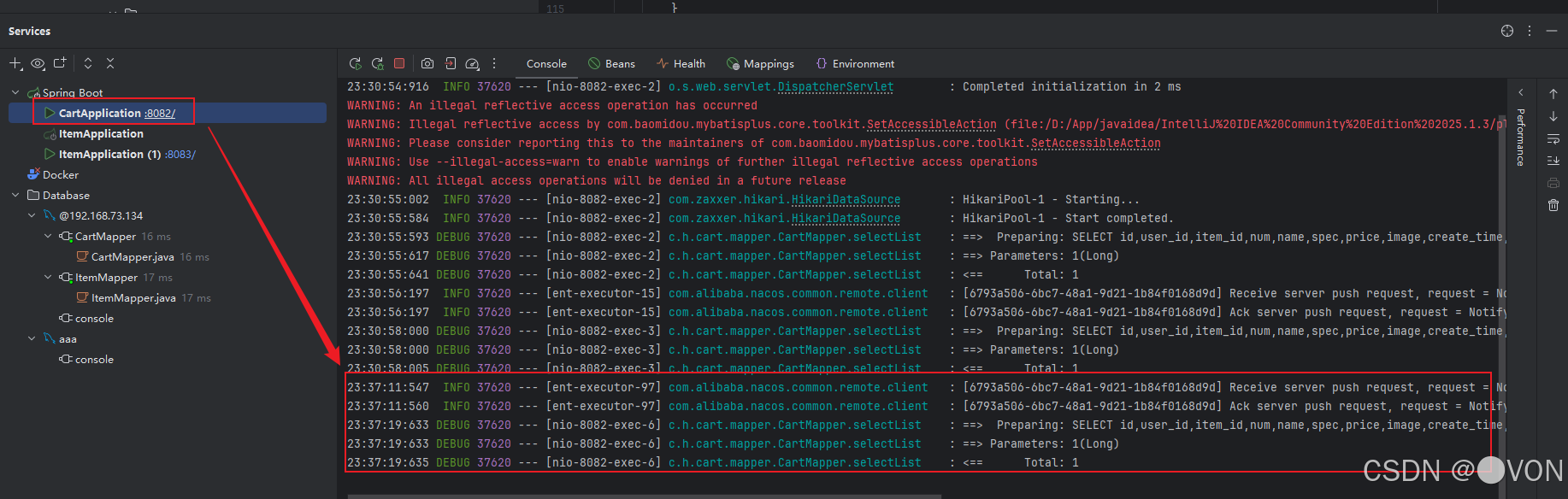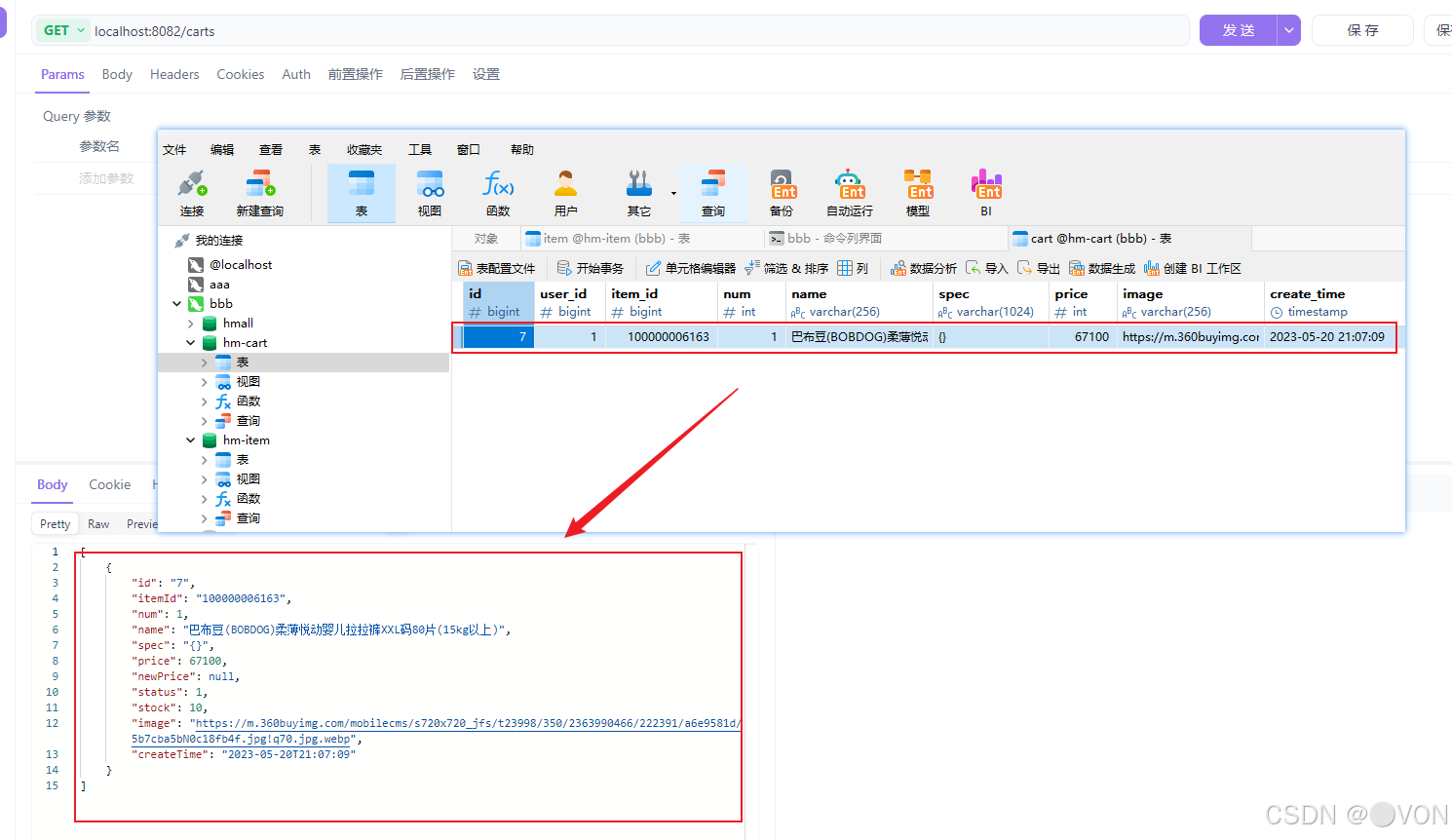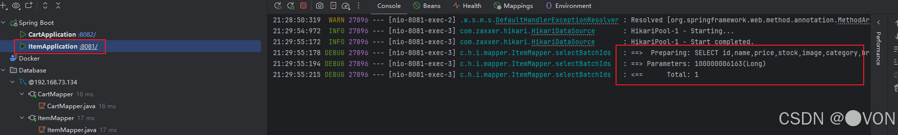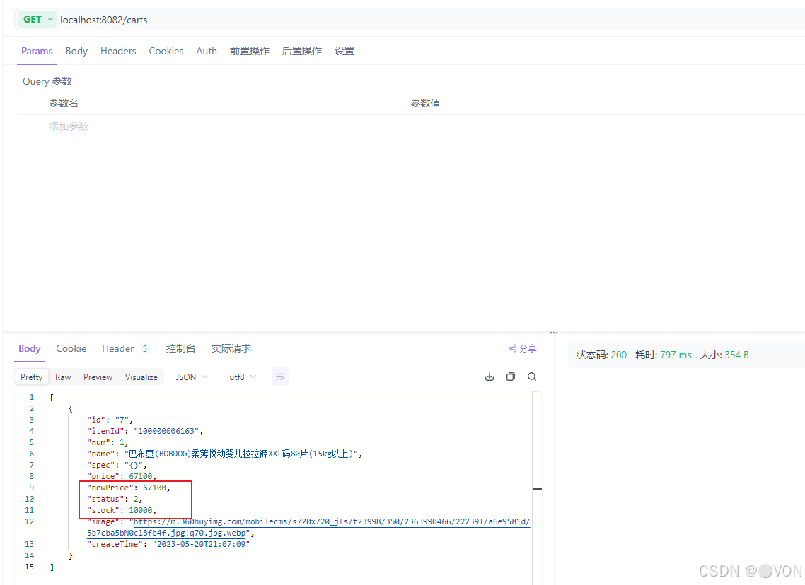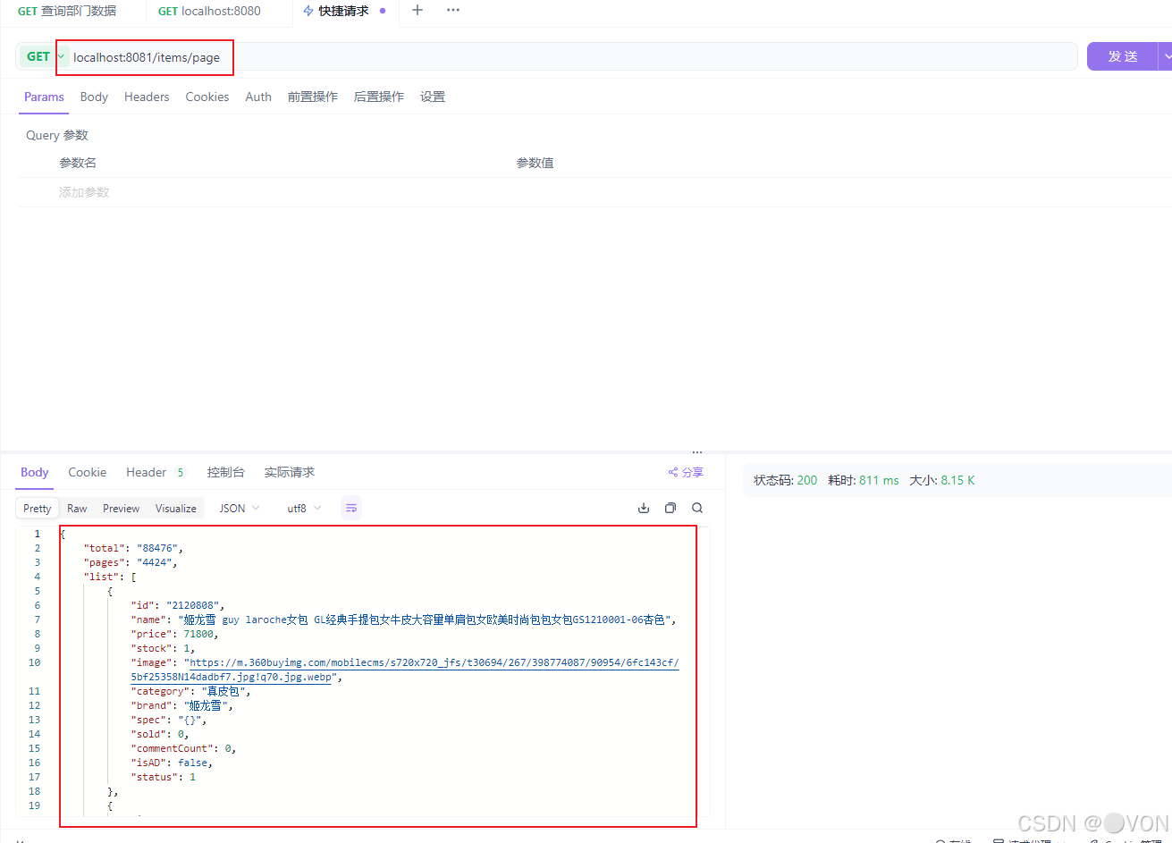 "http://localhost:8081/items?ids={ids}",其中{ids}为路径参数占位符HttpMethod.GETnull(GET请求无请求体)ParameterizedTypeReference<List<ItemDTO>>用于指定泛型返回类型Map.of("ids", CollUtil.join(itemIds, ","))将商品ID列表用逗号拼接这里出现数据就表示成功了