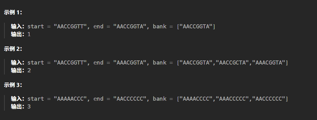 "AACCGGTT" --> "AACCGGTA" 就是一次基因变化。另有一个基因库 bank 记录了所有有效的基因变化,只有基因库中的基因才是有效的基因序列。(变化后的基因必须位于基因库 bank 中)