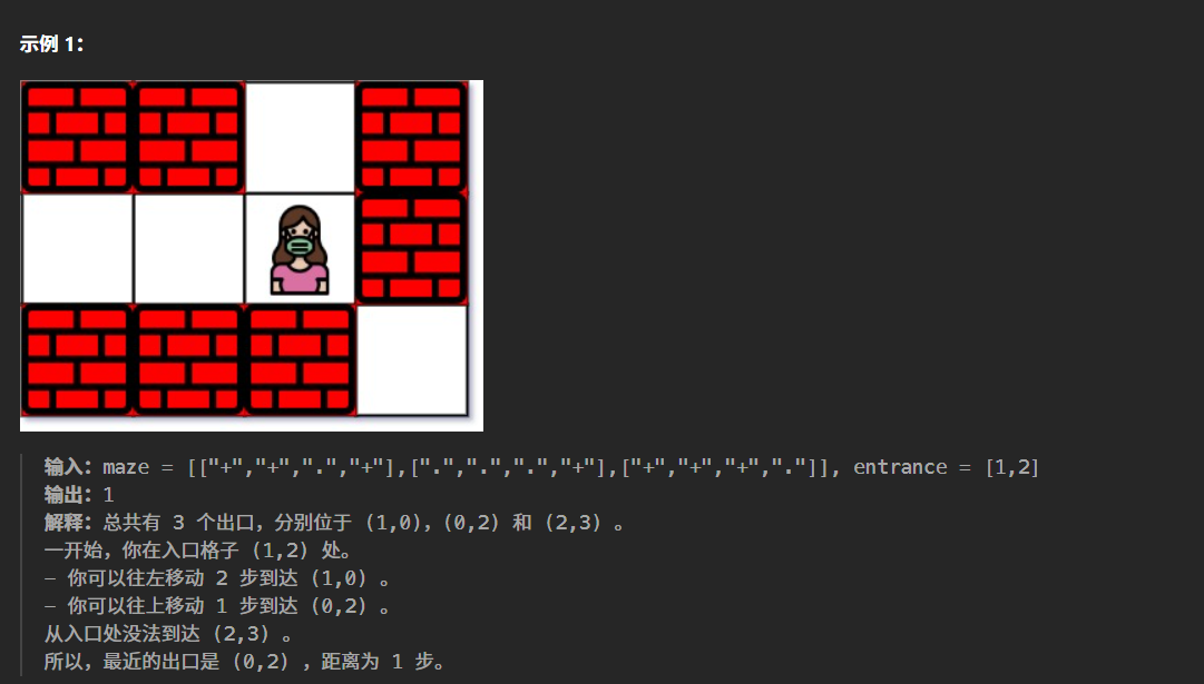 给你一个 m x n 的迷宫矩阵 maze (下标从 0 开始),矩阵中有空格子(用 '.' 表示)和墙(用 '+' 表示)。同时给你迷宫的入口 entrance ,用 entrance = [entrancerow, entrancecol] 表示你一开始所在格子的行和列。