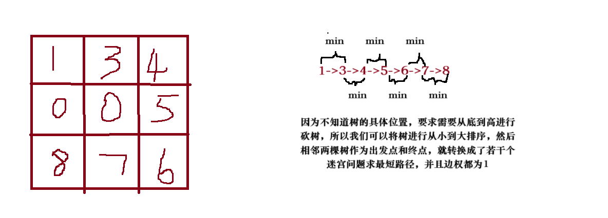 你将从 (0, 0) 点开始工作,返回你砍完所有树需要走的最小步数。 如果你无法砍完所有的树,返回 -1 。