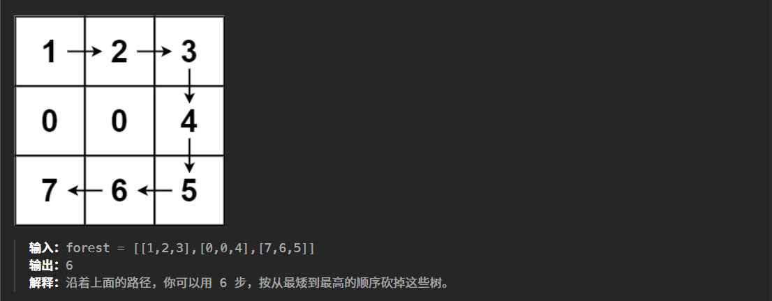 0 表示障碍,无法触碰1 表示地面,可以行走比 1 大的数 表示有树的单元格,可以行走,数值表示树的高度每一步,你都可以向上、下、左、右四个方向之一移动一个单位,如果你站的地方有一棵树,那么你可以决定是否要砍倒它。