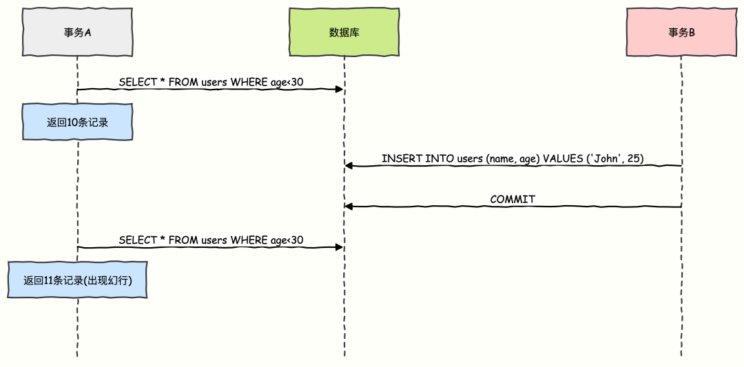 一个事务内,两次执行同一个查询,返回的结果集行数不同。重点在于另一个已提交事务对数据进行了增删(INSERT/DELETE),像产生了幻觉一样。