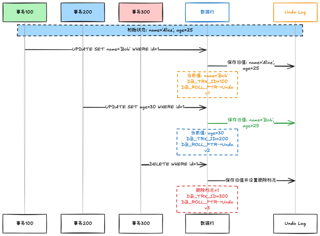 Undo Log 是 MVCC 的基石,它记录了数据变更的历史版本。每次数据修改时,InnoDB 都会在 Undo Log 中保存修改前的数据副本。