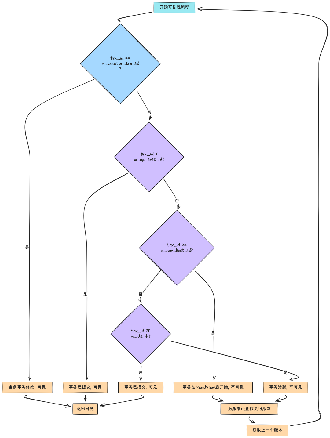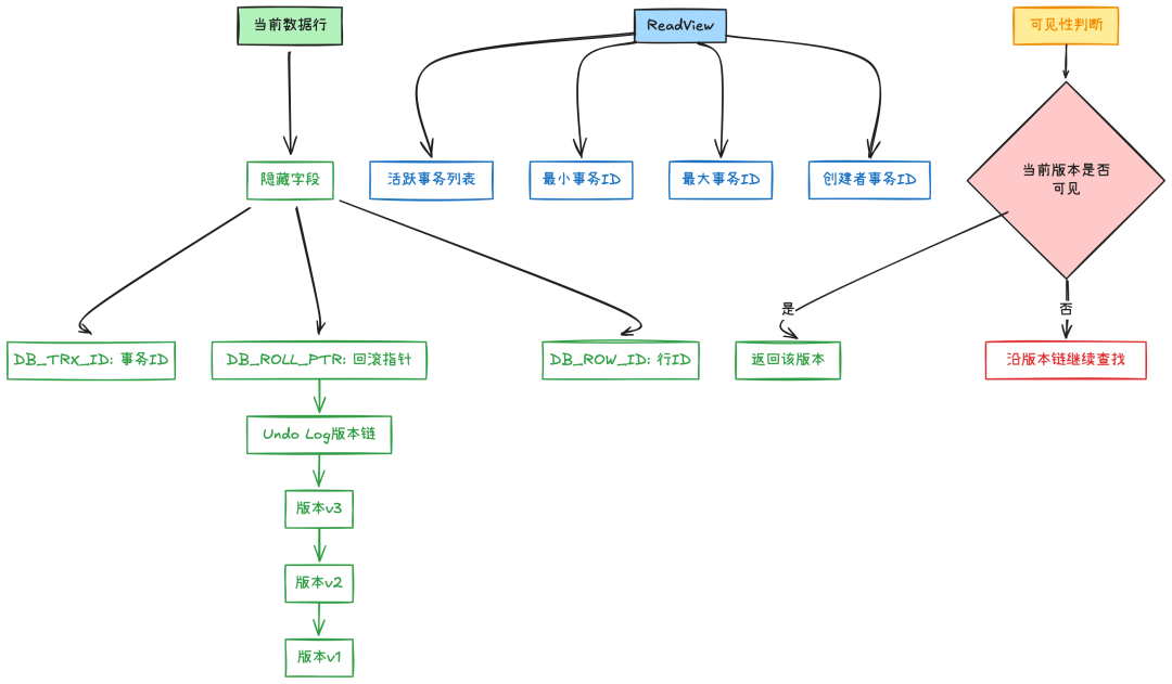 可见性判断是 MVCC 最精妙的部分,它遵循一套严格的算法规则: