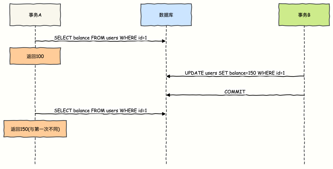 一个事务内,两次读取同一个数据项,得到了不同的结果。重点在于另一个已提交事务对数据进行了修改(UPDATE)。