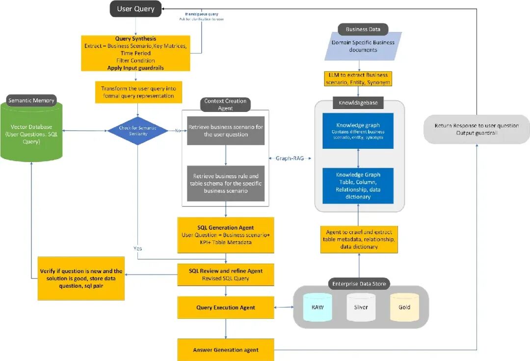 首先,在业务数据提取与转换阶段,我们利用先进的多模态生成式人工智能(GenAI)及文档智能技术来解析不同格式的文档。通过这种方法,可以从 PPT、PDF、Word 和 Excel 文件中提取出有价值的文本内容。接下来,应用命名实体识别(NER)和关系抽取(RE)模型,识别出文档中的关键实体(例如公司名称、产品名称、个人姓名等)及其相互间的关系(如“公司A生产产品B”)。这些实体和关系将作为节点和边被纳入到知识图谱中,形成一个结构化的信息网络。