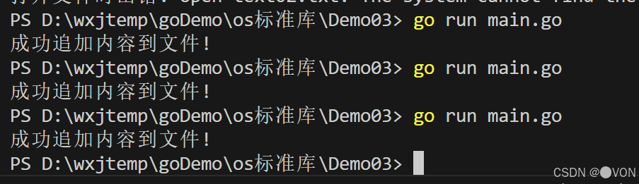 }os.OpenFile 以追加模式写入这种方法适合在已有文件的末尾添加内容,而不会覆盖原有内容。