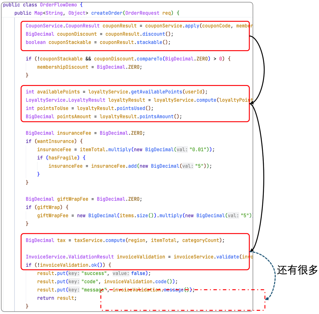 你要经过一些列的接口调用,封装最终的执行逻辑。包括;基本校验、身份校验、设备校验、人脸识别、支付环境、账户信息、风控信息、订单库存、优惠判断(组合优惠)、购物车数据、父子单-拆单等等。一些列操作。