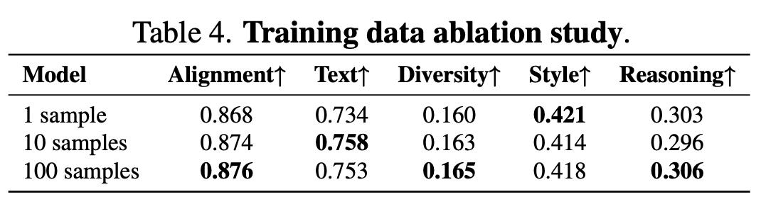极小训练集的惊人有效性 (Surprising effectiveness of extremely small training sets)为了评估分阶段 LoRA 是否可以恢复加速推理,我们最初使用仅 10 个训练样本进行了一个过拟合风格的实验。出乎意料的是,模型迅速学习到了加速采样轨迹的忠实近似。更为显著的是,将数据集减少到仅单个训练样本仍然产生了一种稳定的加速行为。