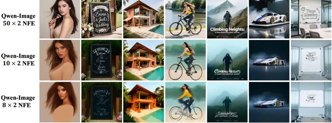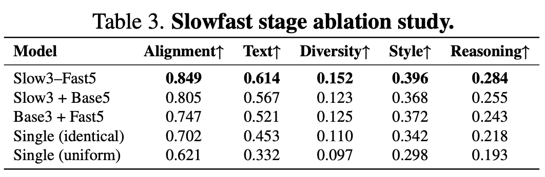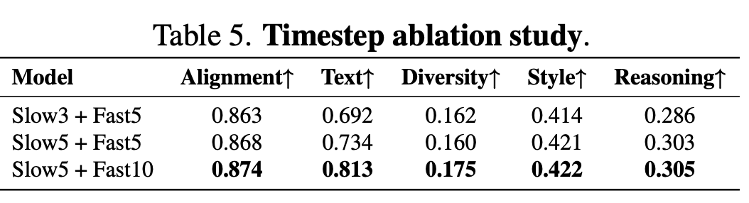 Slow-Fast 设计:对比了多种时间步分配策略,结果显示“慢速阶段3步 + 快速阶段5步”的非对称配置优于均匀分布或单模型配置,证明了针对性加速的必要性。数据规模:将训练样本从 1 个增加到 100 个并未带来显著提升,说明数据的质量和阶段对齐比单纯的数据量更关键。时间步覆盖:更多的 LoRA 适配时间步能带来更好的文本渲染和整体质量。