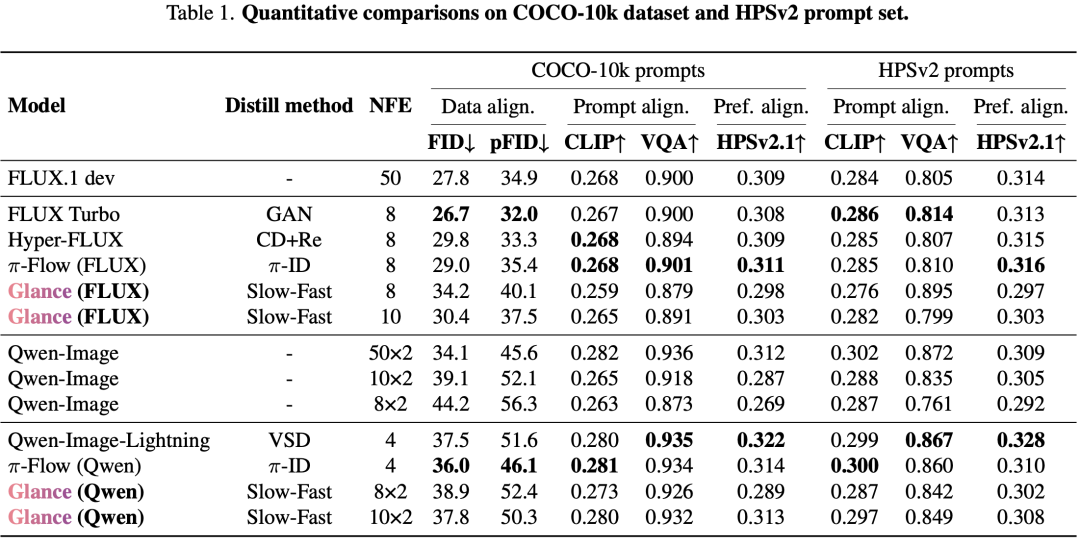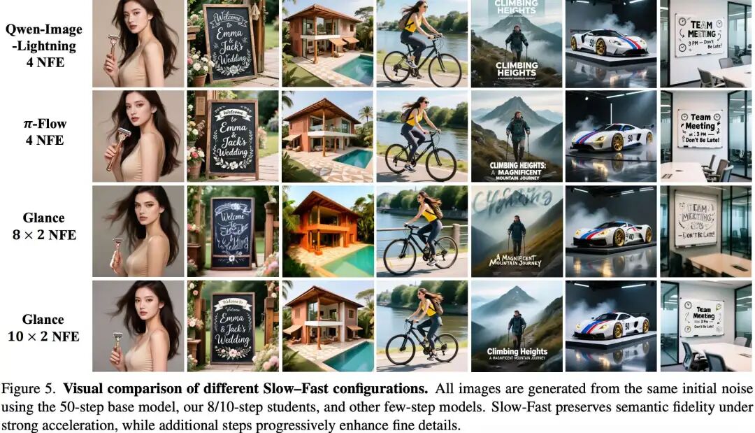视觉质量:定性对比(图5)显示,Glance 在 8 步推理下保留了语义完整性,而其他 4 步模型(如 Lightning)可能在细节上有所欠缺。