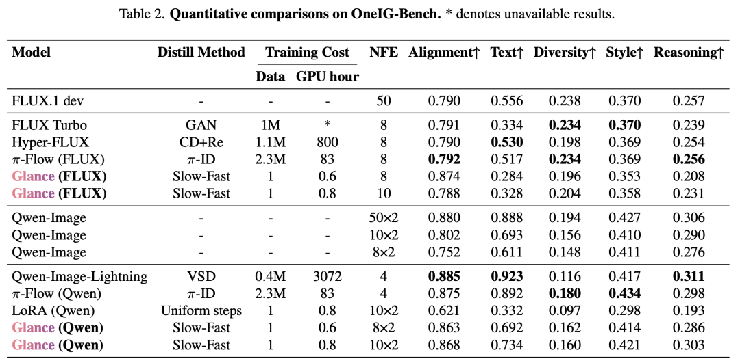 定量对比:在 OneIG-Bench、HPSv2 和 GenEval 上,Glance 分别达到了教师模型 92.60%、99.67% 和 96.71% 的性能。即使与需要数千 GPU 小时训练的方法(如 DMD2, Qwen-Image-Lightning)相比,仅训练 1 小时的 Glance 也展现出可比甚至更优的效果。
