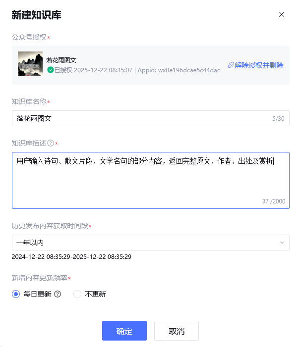 3.知识库优化:设置关键词标签(如 “唐诗”“宋词”“离别主题”“文案素材”),提升检索精准度;开启 “自动更新” 功能,后续新增公众号文学推文可自动同步至知识库。