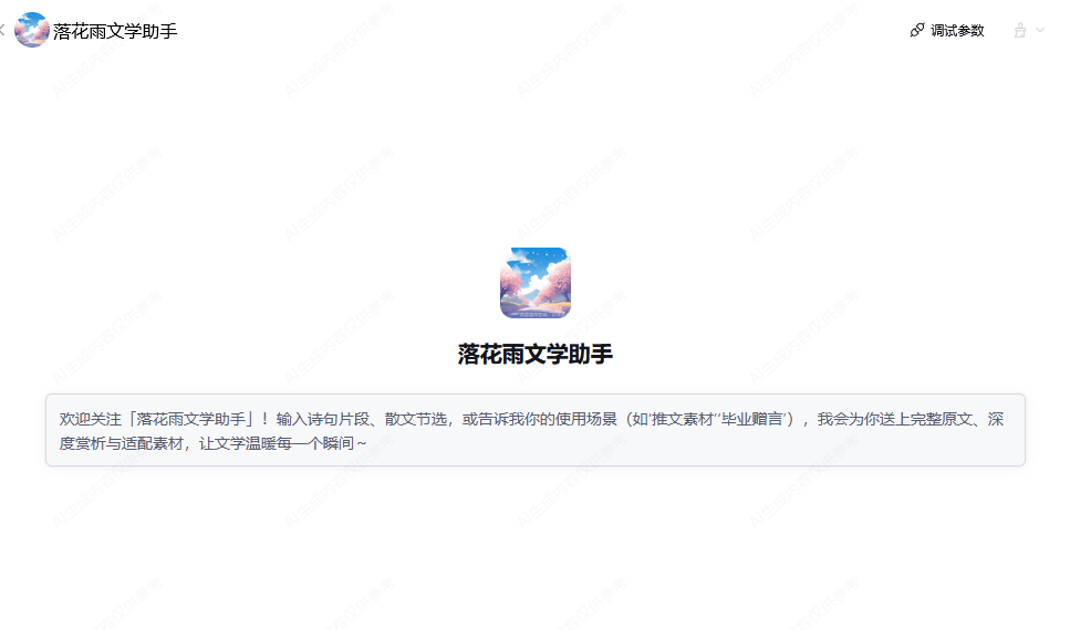 智能体名称:落花雨文学助手(无需授权认证,直接填写即可)
