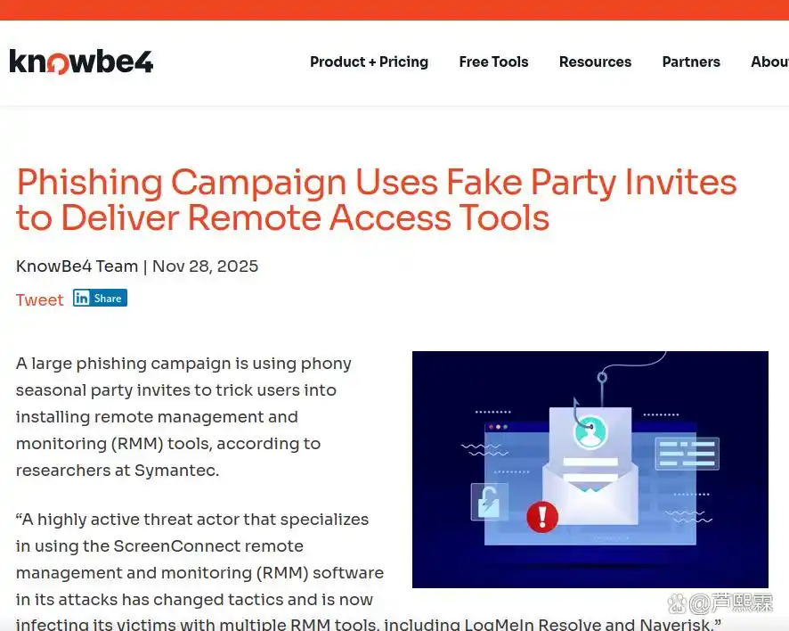 2025年第四季度,Symantec 与 KnowBe4 联合披露的一起钓鱼活动引起了广泛关注。该活动以“December Holiday Party”或“Party Invitation”等节日主题邮件为诱饵,目标覆盖企业员工、行政人员及管理层。邮件内容高度逼真,包含具体时间、地点、着装要求及RSVP链接,附件多为伪装成PDF或DOCX的Office文档或ZIP压缩包。一旦用户启用宏或解压执行内嵌脚本,系统将静默下载并安装RMM客户端,攻击者随即获得对主机的完全控制权。