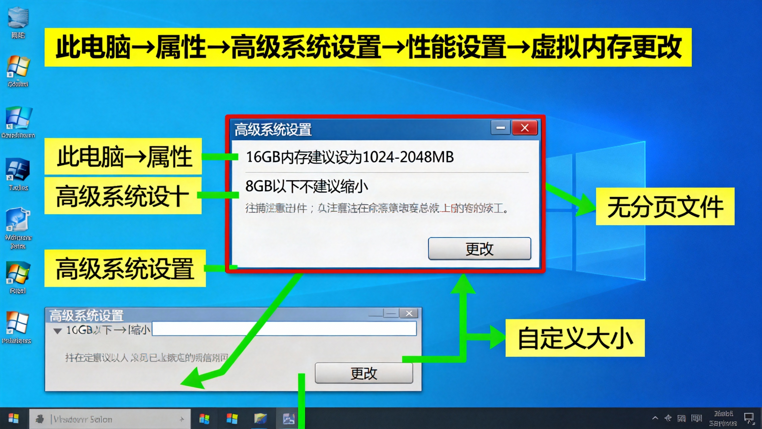 - 操作步骤:右键点击“此电脑”→选择“属性”→左侧“高级系统设置”→在弹出的窗口中点击“高级”选项卡→点击“性能”区域的“设置”→切换到“高级”选项卡→点击“虚拟内存”区域的“更改”;
