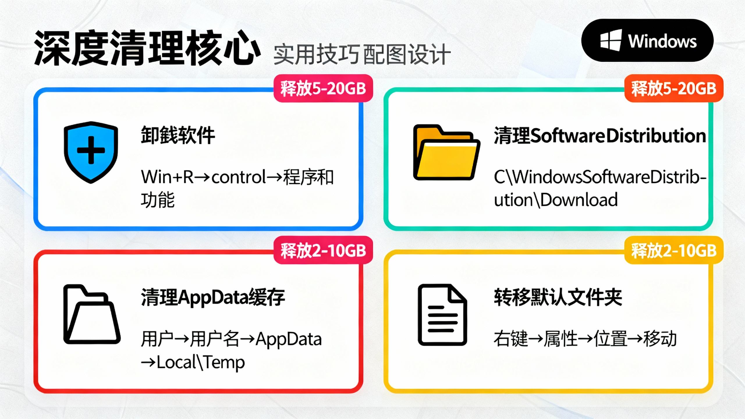- 深度清理:卸载不常用大软件→清理SoftwareDistribution缓存→清理AppData缓存→转移默认文件夹;