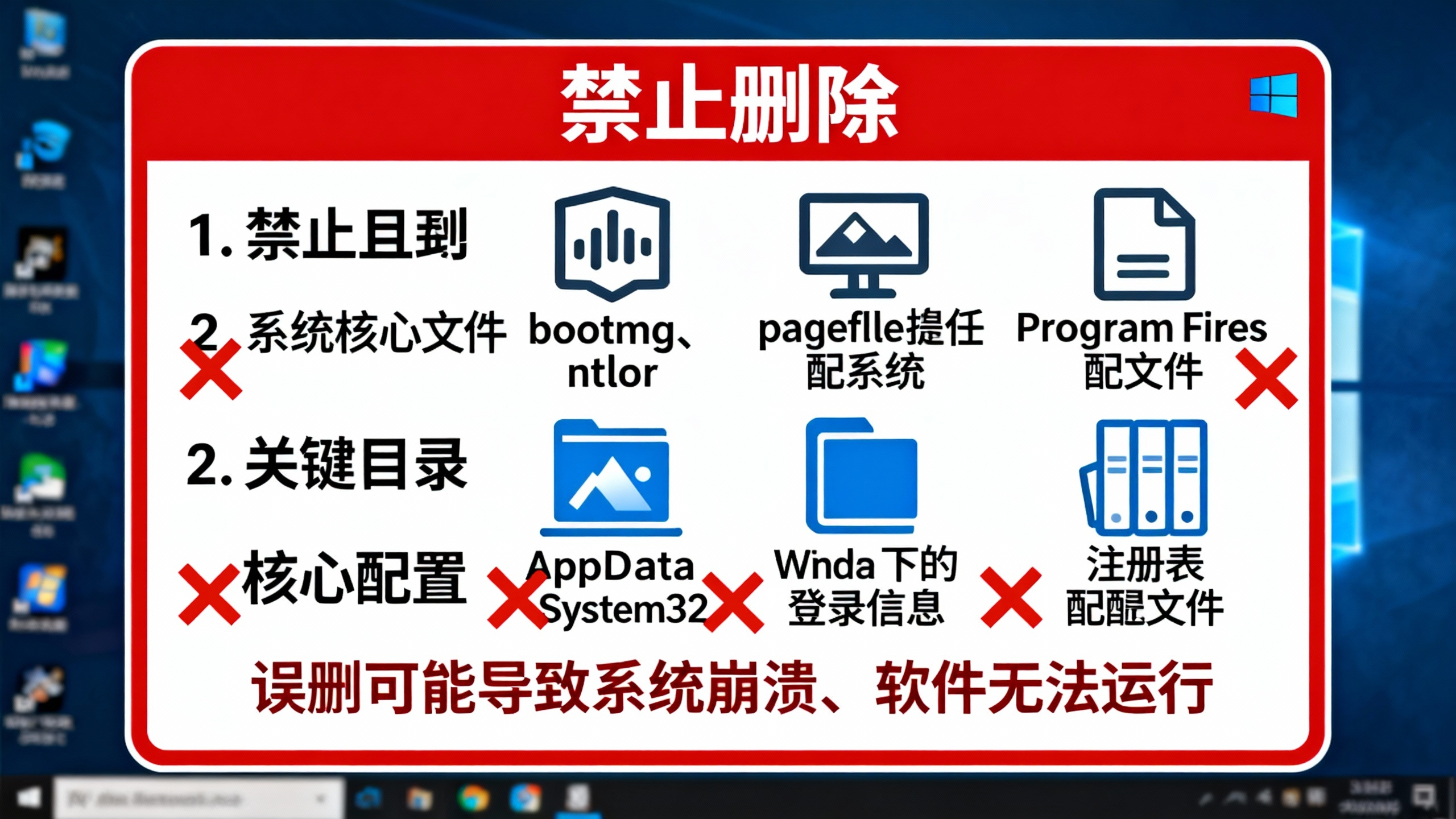 - 用户目录下的AppData文件夹内的核心配置文件(如软件的登录信息、注册表配置,清理时优先删除缓存目录,而非整个AppData文件夹)。